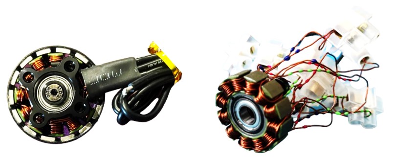 1. BLDC-двигатель 2806 + 1350kV до перемотки (слева) и после перемотки с убранным ротором (справа) | |