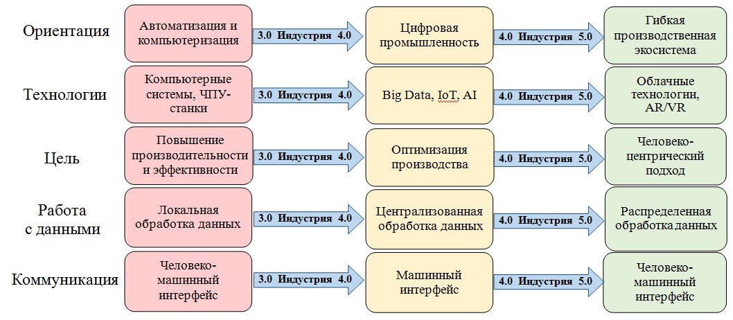 • Для обоснования необходимости перехода к более перспективным моделям производства и развития выделены основные отличительные особенности Индустрии 3.0, Индустрии 4.0 и Индустрии 5.0, определяемые уникальной ориентацией, технологиями, целями, подходами к работе с данными и типами интерфейсов.