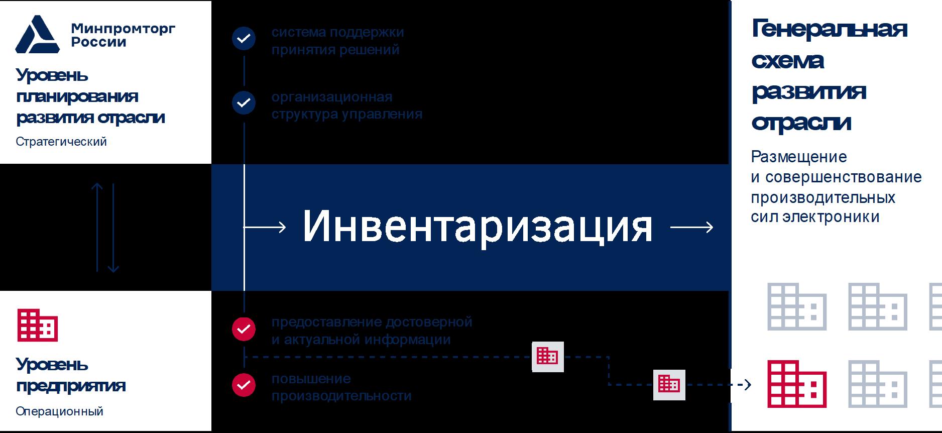 • Выстроена реальная и практически осуществимая цепочка внедрения цифровых технологий в управление электронной промышленностью, первым шагом в которой должна стать инвентаризация всех факторов воспроизводства.
