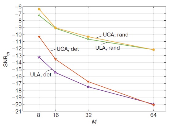 • Выявлены общие закономерности между этими пороговыми значениями, конфигурациями антенных решеток, типом обрабатываемого сигнала и используемым алгоритмом оценивания.