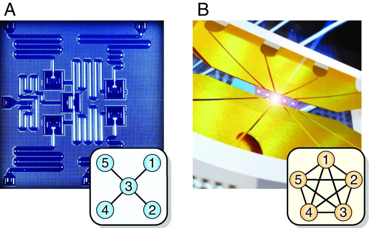1. Рис. 2. Графическое представление архитектуры квантовых компьютеров, задействованных в эксперименте [14]: А – архитектура компьютера IBM на основе сверхпроводящих кубитов, связанных микроволновыми резонаторами