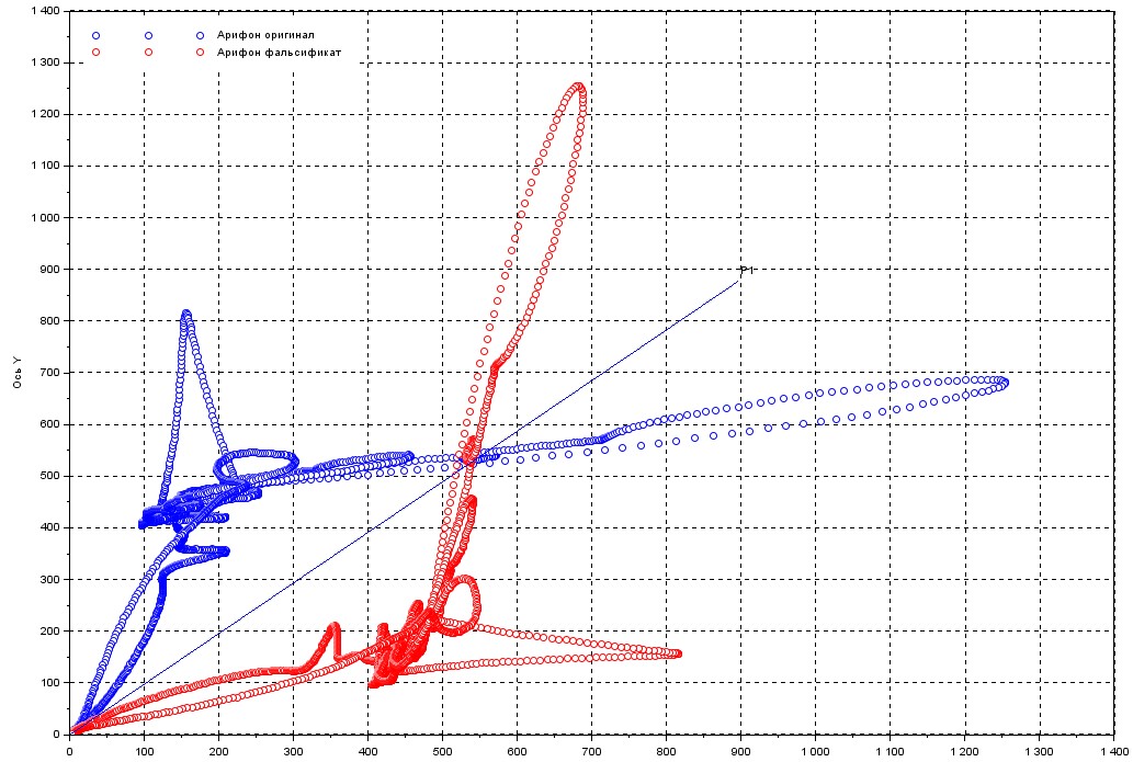 1. Рис. 6. Матрица исходных данных сглаженных дифракционных спектров референтного (синий) и фальсифицированного (красный) ЛС Арифон в координатах Xj,2,Xj,1 и Xj,1,Xj,2 с изображением ГК Р1.