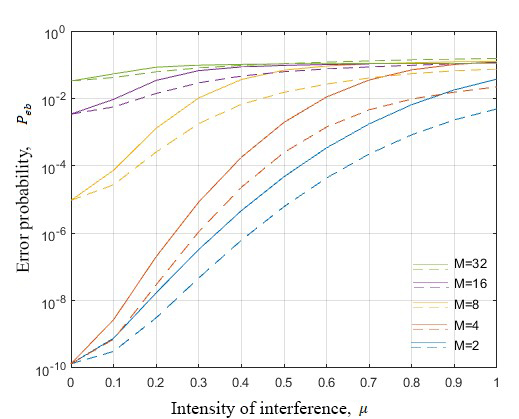 Энергетические и спектральные преимущества сигналов с фазовой манипуляцией предопределили их широкое применение в современных цифровых навигационных, связных и телевизионных системах. Использование таких сигналов заложено в коммуникационных стандартах DVB-S, DVB-S2/S2X, ГЛОНАСС, CDMA, WiFiIEEE 802.11 и др. Для повышения пропускной способности радиоканалов применяют многопозиционную фазовую манипуляцию (М-ФМ), что способствует увеличению количества возможных фазовых состояний сигнала и, как следствие, информационной емкости канального символа. Однако такое увеличение существенно влияет на помехоустойчивость приема сигналов М-ФМ. В статье методами статистической радиотехники проанализирована помехоустойчивость приема сигналов с многопозиционной фазовой манипуляцией в присутствии шумовой и фазоманипулированной помехи. Проведены расчеты вероятности битовой ошибки от отношения сигнал/шум, интенсивности помехи, относительной скорости передачи помехи и от ее расстройки относительно центральной частоты спектра полезного сигнала. Показано, что сигналы с многопозиционной фазовой манипуляцией весьма значительно подвержены влиянию фазоманипулированной помехи. С увеличением позиционности сигналов это влияние усиливается. Степень снижения помехоустойчивости приема зависит от величины относительной скорости передачи помехи и ее интенсивности. Поражающее действие фазоманипулированной помехи наиболее заметно проявляется при ее попадании в главный лепесток спектра сигнала. По мере увеличения относительной скорости передачи помеха становится более широкополосной и псевдошумовой, и ее влияние сказывается даже при весьма больших частотных расстройках, несколько снижаясь в области главного лепестка спектра сигнала. Наблюдаемое снижение представляется закономерным, так как анализируемый алгоритм приема сигналов М-ФМ оптимален к воздействию именно шумовой помехи.