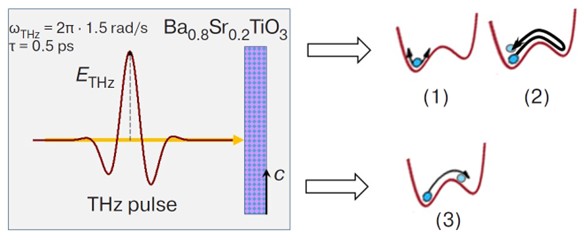 Результаты. Представлены временные зависимости поляризации, а также эффективной амплитуды колебаний инфракрасно-активной моды при варьировании параметров ТГц-поля и констант разложения термодинамического потенциала неравновесного состояния в виде ряда по степеням параметра порядка в разных режимах воздействия, включая изменение температуры и дополнительное воздействие внешнего электрического поля.