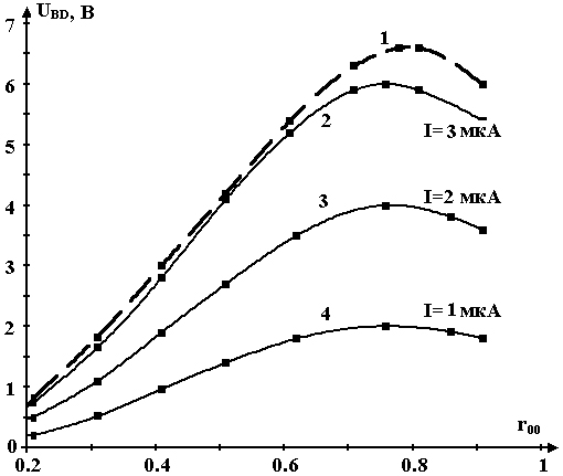 1. Рис. 2. Экспериментальная зависимость напряжения UBD = f(r00) при Iвх = 3.0 мкА и θ = π/4 (кривая 1) и теоретические зависимости напряжения UBD = f(r00) при Iвх = 3.0, 2.0, 1.0 мкА и θ = π/4 (соответственно кривые 2, 3, 4).