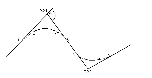 1. Рис. 1. Элементы искомого сплайна: AB, CD, EF, GH – клотоиды; BC, FG – окружности; DE – прямая вставка; θ – угол поворота. | |