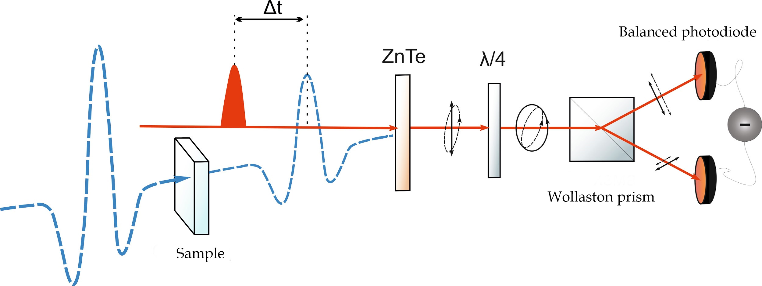 1. Рис. 1. Схематическое изображение экспериментальной установки и принципа электрооптического детектирования ТГц-излучения. Сплошными черными линиями обозначена поляризация изначально падающего зондирующего излучения, пунктиром – во время воздействия ТГц-