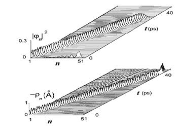 1. Рис. 2. Результаты расчета захвата избыточного электрона, помещенного в начальный момент времени на первую молекулу цепочки, акустическим солитоном с энергией E = 0.49 эВ. Солитон возбуждается смещением в начальный момент времени первой молекулы из положе | |