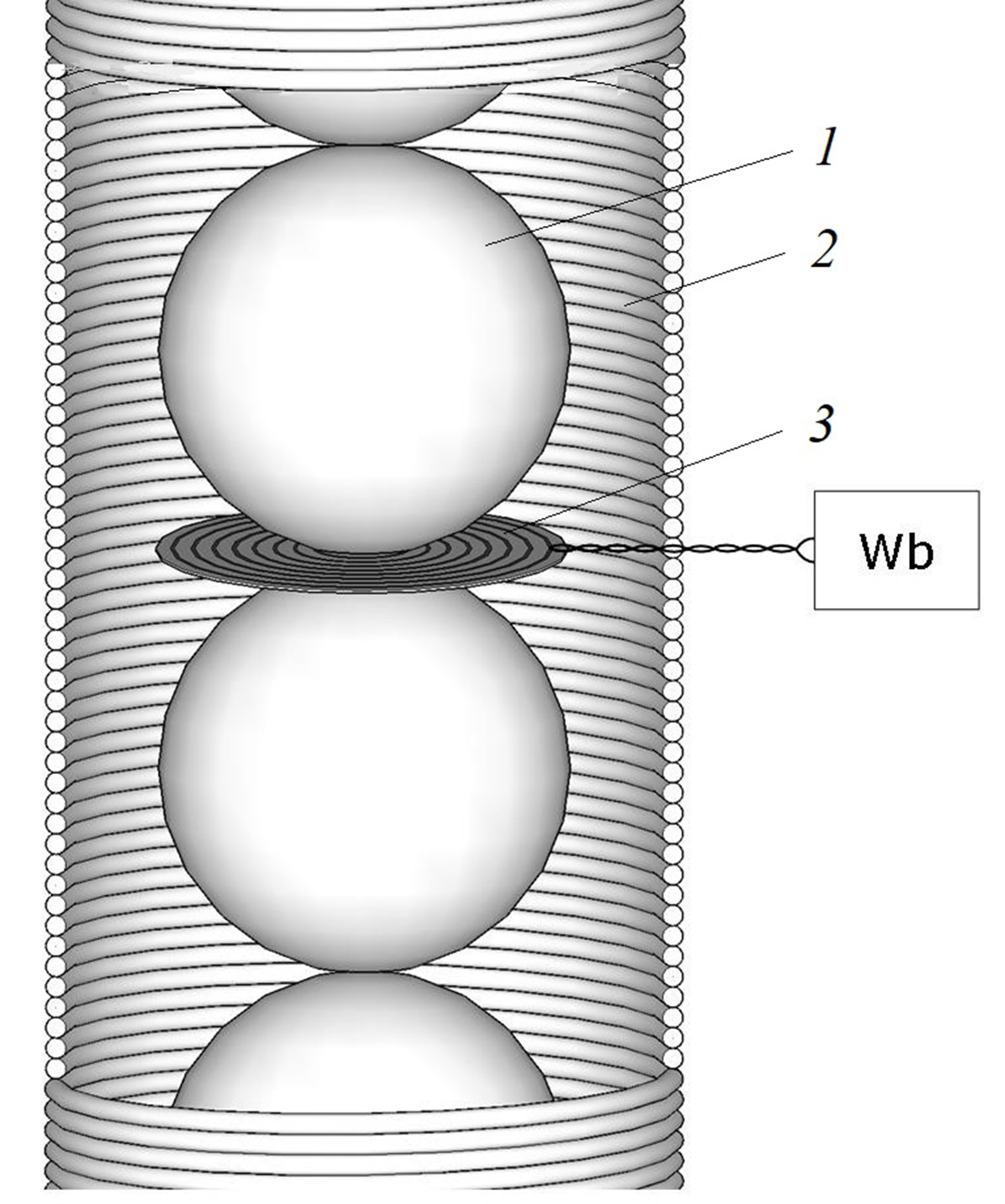1. Цепочка шаров 1, намагничиваемая в поле соленоида 2 с контурами-датчиками 3