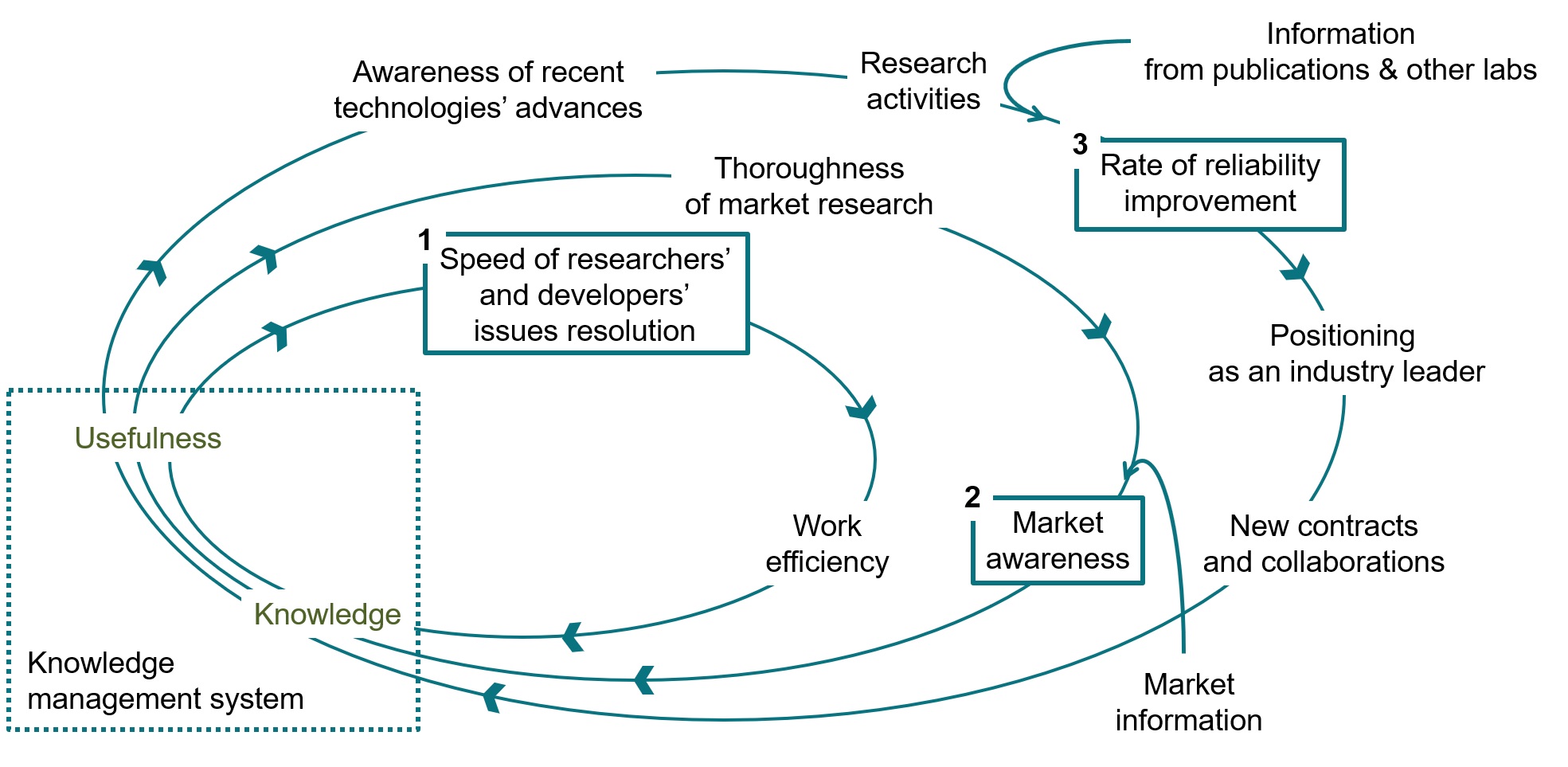 1. Циклы положительной обратной связи с точки зрения бизнес-процессов в социальном, коммерческом и научно-техническом аспектах, которые образуются при внедрении корпоративной базы знаний по технологиям микроэлектроники