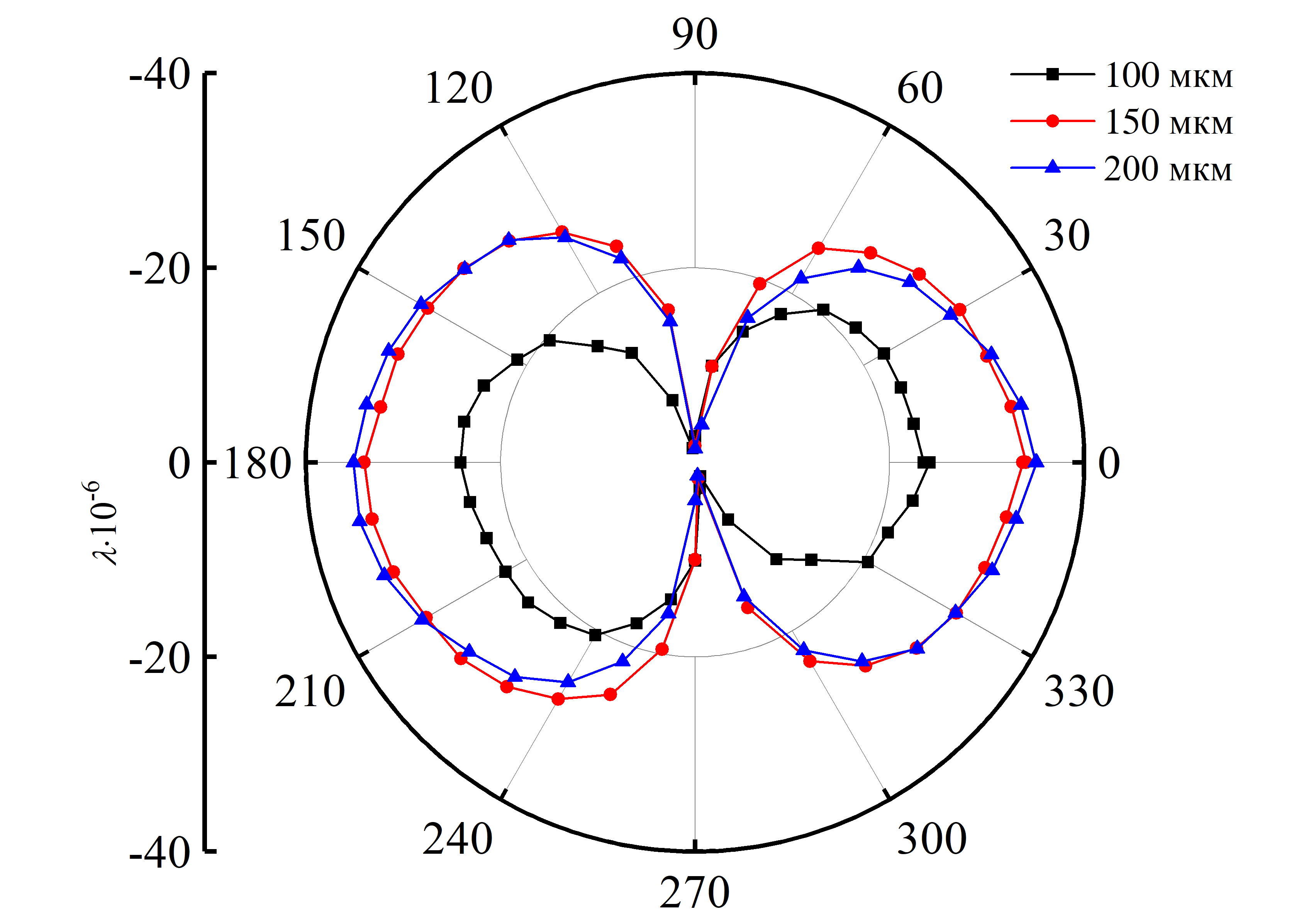 Результаты. Были изготовлены структуры с диаметрами никелевых проволок 100, 150 и 200 мкм. Измерены полевые зависимости магнитострикции МВК, а также частотные, полевые и амплитудные зависимости МЭ напряжения для случая линейного МЭ эффекта при различной величине угла между направлением магнитного поля и проволоками. Показано, что все образцы обладают сильной анизотропией относительно направления магнитного поля. МЭ напряжение уменьшается от максимального значения до нуля при изменении направления магнитного поля с параллельного до перпендикулярного относительно волокон никеля.