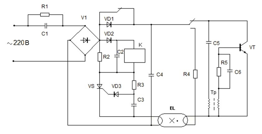 1. Схема включения и питания УФ разрядной лампы с номинальным напряжением 220 В