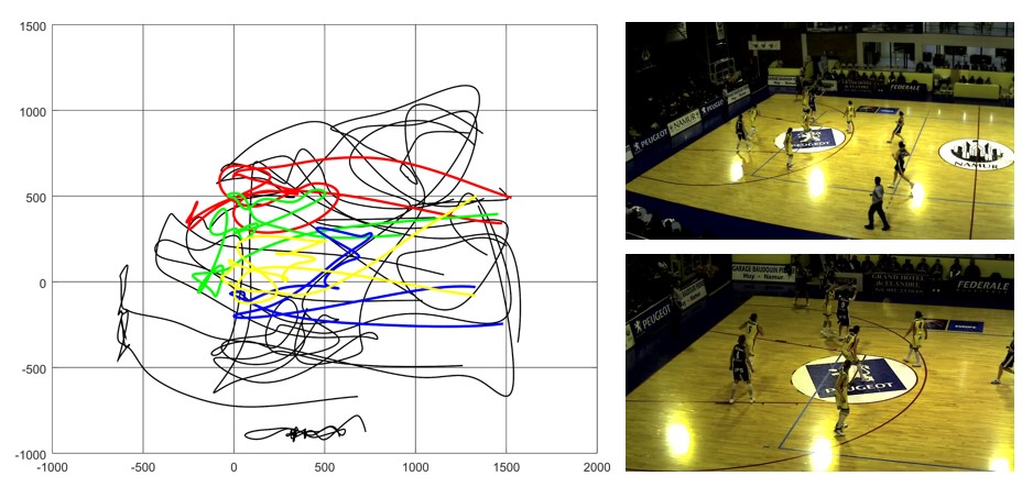 1. Эталонные траектории движения игроков (слева) и кадры с первой и седьмой камер (справа)