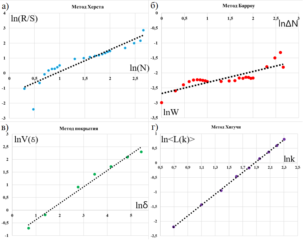 • Для определения параметра фрактальной размерности использовались методики Херста, Барроу, минимальной площади покрытия и Хигучи.
