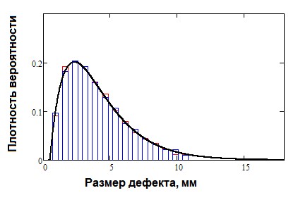 Результаты. По итогам проведенных расчетов построены кривые плотности вероятности обнаруженных дефектов в зависимости от размера дефекта, определены восстановленные значения параметров распределения дефектов при различных условиях испытаний, сделана оценка погрешности восстановления параметров. Для оценки степени несовершенства системы используется кривая вероятности обнаружения дефекта конкретной системой контроля.