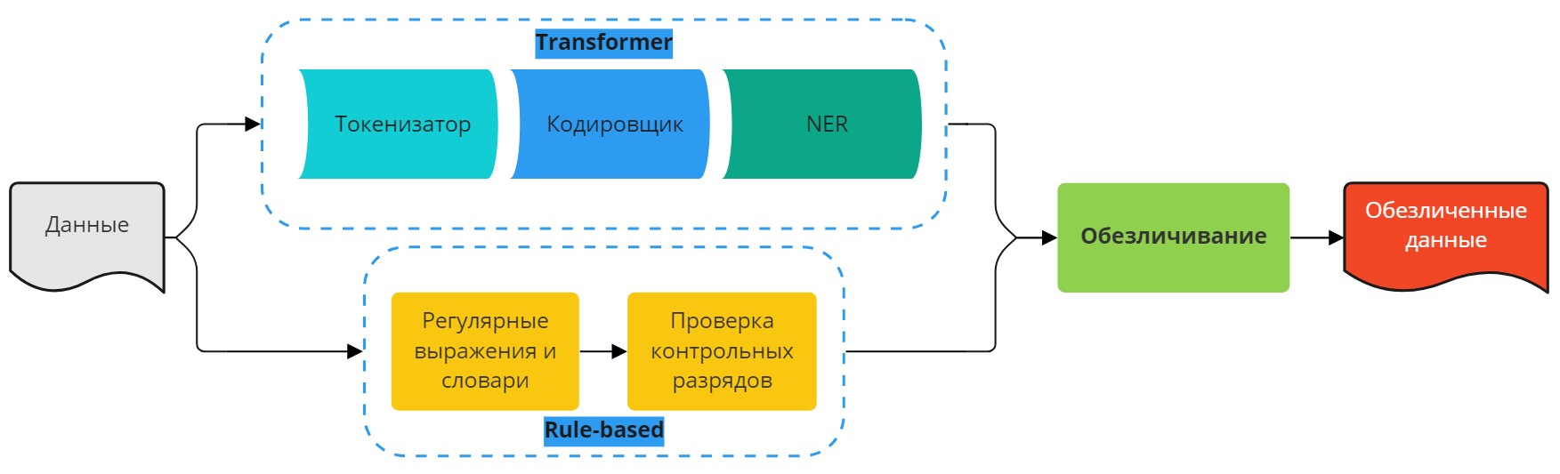 Методы. Предлагается использовать модели искусственного интеллекта для реализации системы автоматического обезличивания КИ, т.к. это дает возможность распознавать КИ даже в неструктурированных данных с достаточно высокой точностью без привлечения человеческого труда. Для повышения точности всей системы обезличивания предлагается использовать алгоритмы на основе правил.