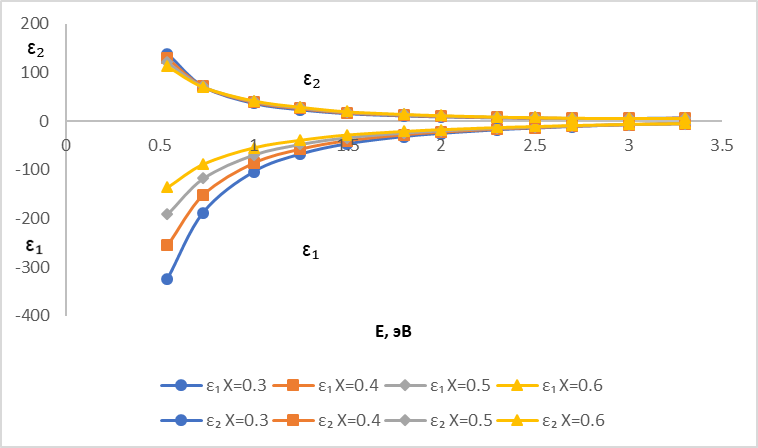 1. Спектральные зависимости действительной (ε1) и мнимой (ε2) частей комплексной диэлектрической проницаемости для различных объемных концентраций кобальта
