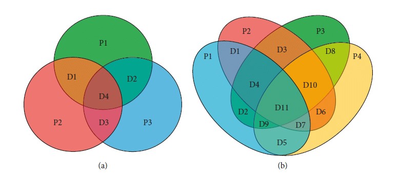 1. Диаграммы Венна, описывающие биты проверки четности и биты данных: (а) код Хэмминга (7,4), (б) код Хэмминга (15,11)