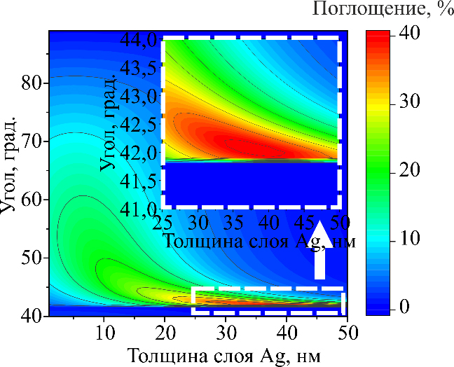 Выводы. На основе численных исследований конфигурации модели Кречмана обнаружено, что оптимальными параметрами для максимального поглощения в монослойной пленке являются: толщина слоя серебра, не превышающая 20 нм, и угол падения света от 55° до 85°. Установлено, что максимальное поглощение в двумерной пленке составляет лишь часть от общего поглощения всей структуры. Таким образом, для достижения максимальной эффективности в определенных оптоэлектронных приложениях необходим индивидуальный подход к выбору параметров.